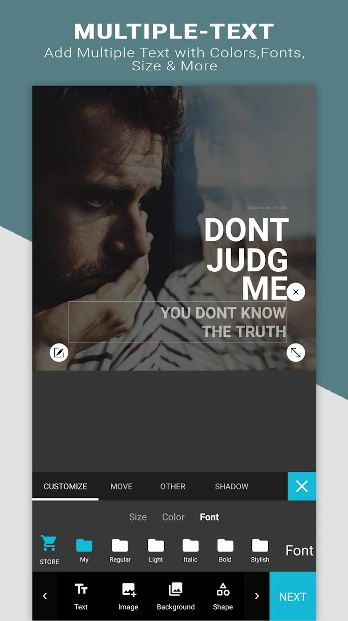- Text: You can add text with 70+ different types of fonts for different kind of quotes and occasions. You can also add a background color to the font, add/change stroke and shadow to your text. You can also change opacity, size, color, and alignment of your text. You can also add an underline to your text and rotate it.